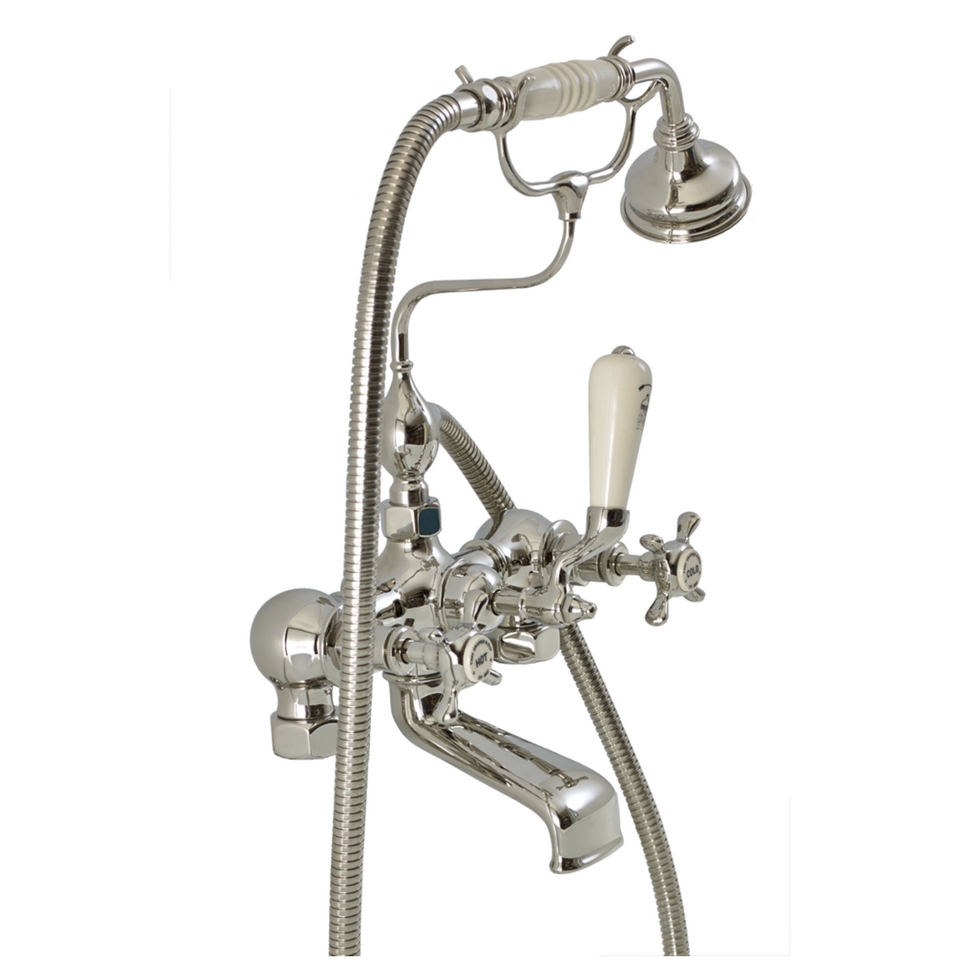 Most Victorians were content with a pair of bath taps, however today many people want a hand spray as well. Therefore we have produced a new mixer set with the correct proportions and we have added many authentic flourishes from the period. For instance, note the china parts – made of earthenware not vitreous china; the tap ‘headworks’, matching those on our washbasin taps; the early-pattern handset and rose is an uncommon design, elegant and authentic. The graceful ‘swan neck’ hand spray cradle is an exact copy of a rare original, which brings the handset forward so that any drips fall into the bath. The Thomas Crapper Bath Shower Mixer is engineered in solid brass, with period details but incorporating modern technology in the form of ceramic-disc cartridges for ease of maintenance. It is available with either wall or deck unions and this special offer version is available in a Chrome plate finish.